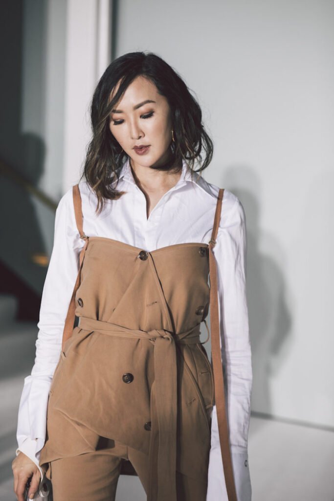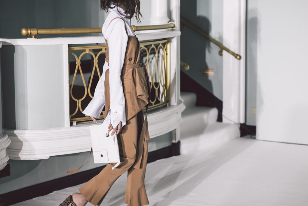 When it came to curating my look for the show, I gravitated toward an outfit that would pay homage to these earthy inspirations. The centerpiece was a deconstructed trench coat–inspired top paired with flare pants—a combination that exuded both sophistication and an avant-garde edge. Typically, my day-to-day wardrobe revolves around a neutral color palette, but on this occasion, I felt compelled to extend that minimalist approach into every facet of my ensemble, including my makeup.