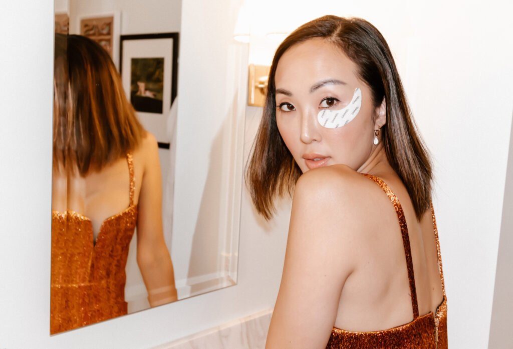 • 24-karat gold hydrogel masks refracting champagne flute clinks